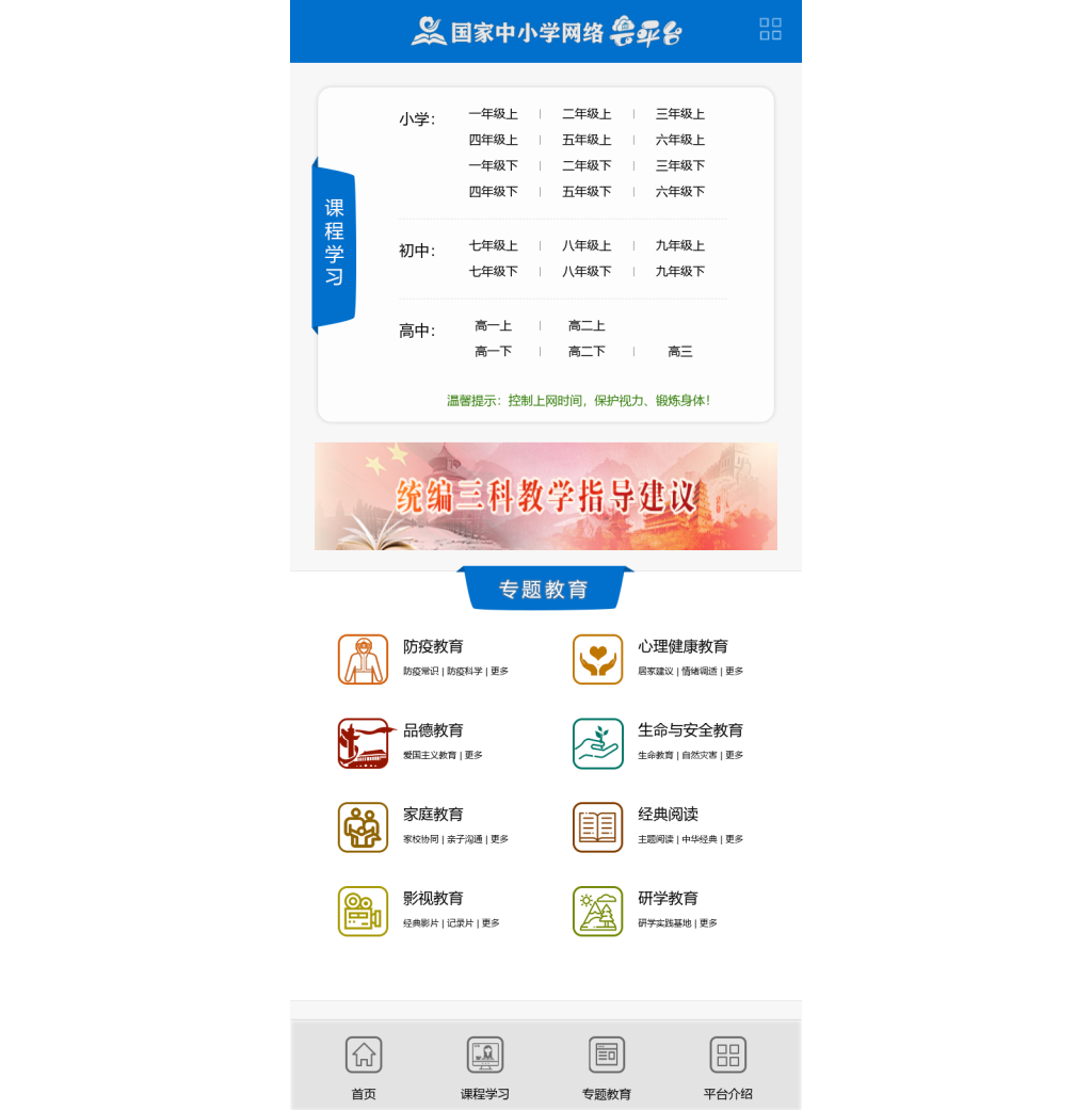 教育部在疫情期间开设的平台,平台除了有小学到高中所有科目的相关课程,还包括防疫教育、品德教育、课程学习、生命与安全教育、心理健康教育、家庭教育、经典阅读、研学教育、影视教育等资源。平台所有学习资源均免费使用,网课教师多为名师。